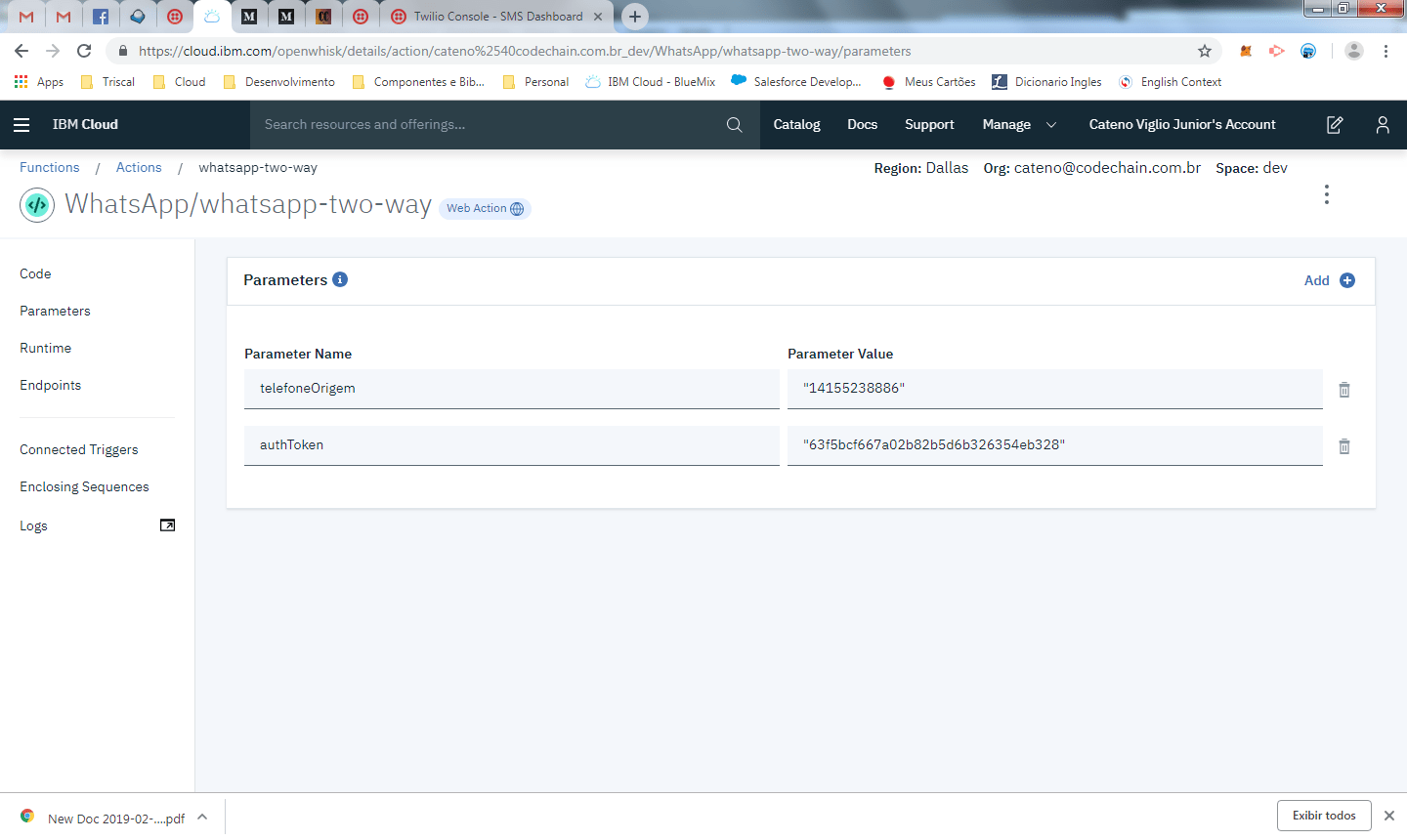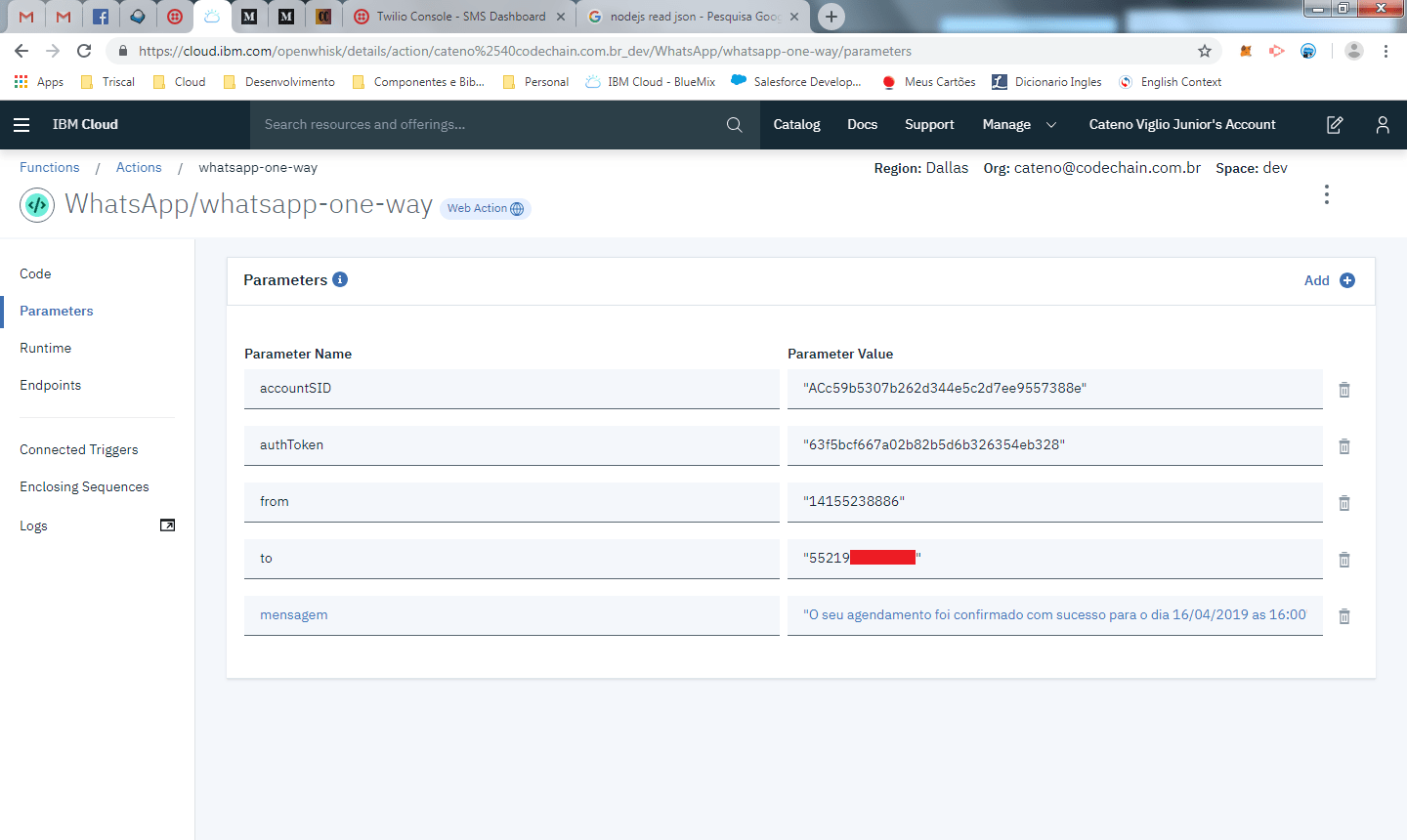 O telefone de origem deixamos fixo no parâmetro, mesmo recebendo ele pelo Twilio. O authtoken por motivos óbvios, continua sendo informado nos parâmetros fixos da função.