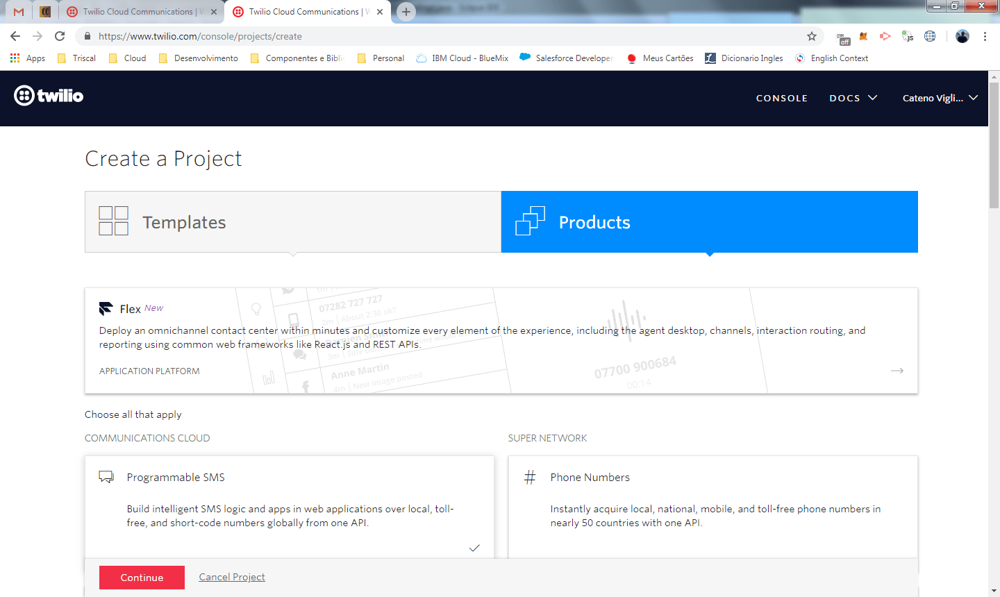 Clique em Create New Project. Na tela seguinte selecione Products e escolha o produto Programmable SMS.