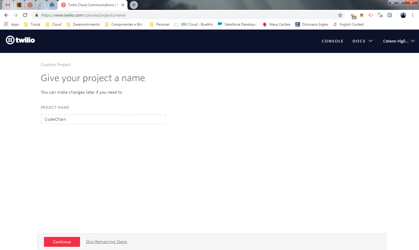 Na tela seguinte, você deve escolher o nome do projeto. O nosso projeto se chama codechain.