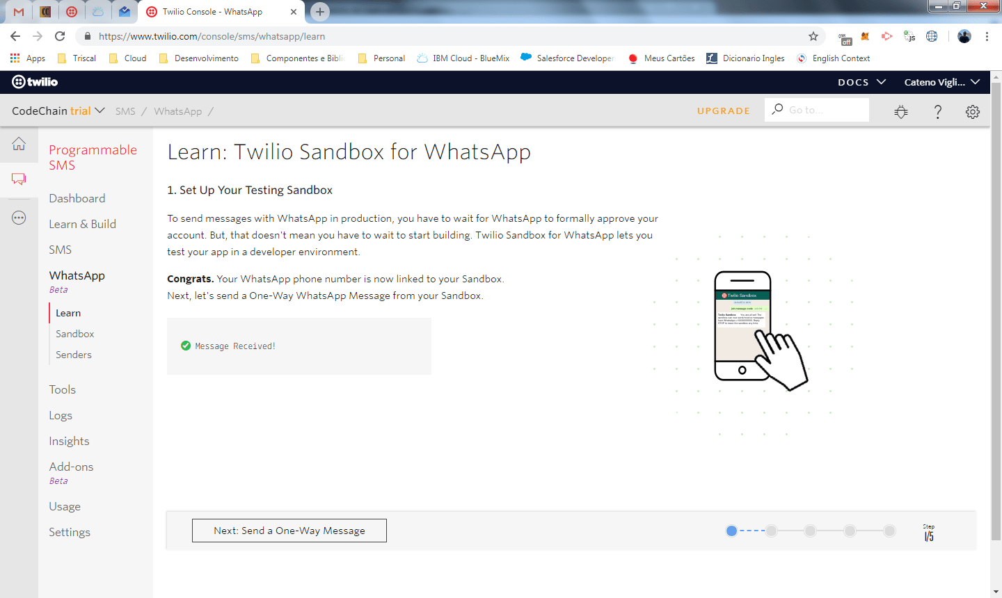 Lembrando que estamos em um ambiente de sandbox e que as mensagens enviadas neste modelo one-way, precisam ser aprovadas pelo whatsapp.