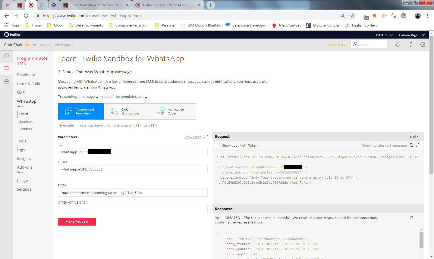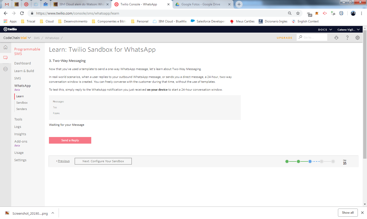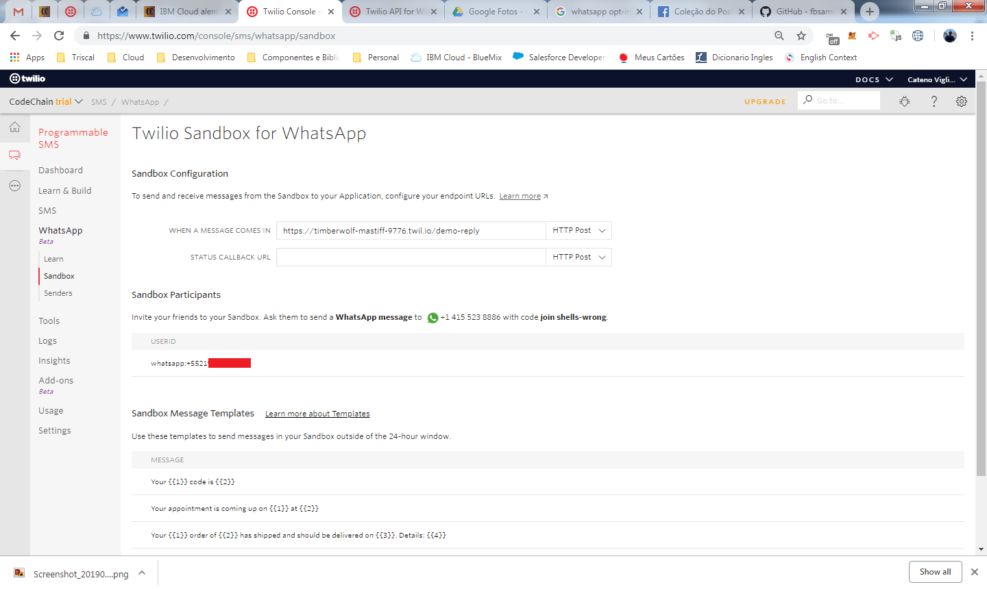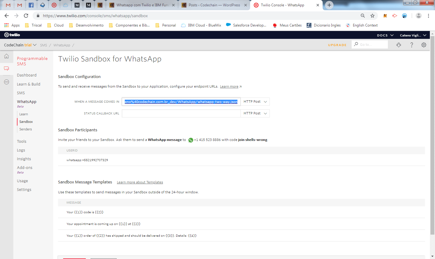Com esse ultimo teste, fechamos o modulo de Learn e já obtemos exemplos, incluindo código em curl/nodejs, para iniciarmos a integração com o whatsapp através do Twilio. Clique no link sandbox no Twilio e vamos dar uma rápida olhada nas configurações.
