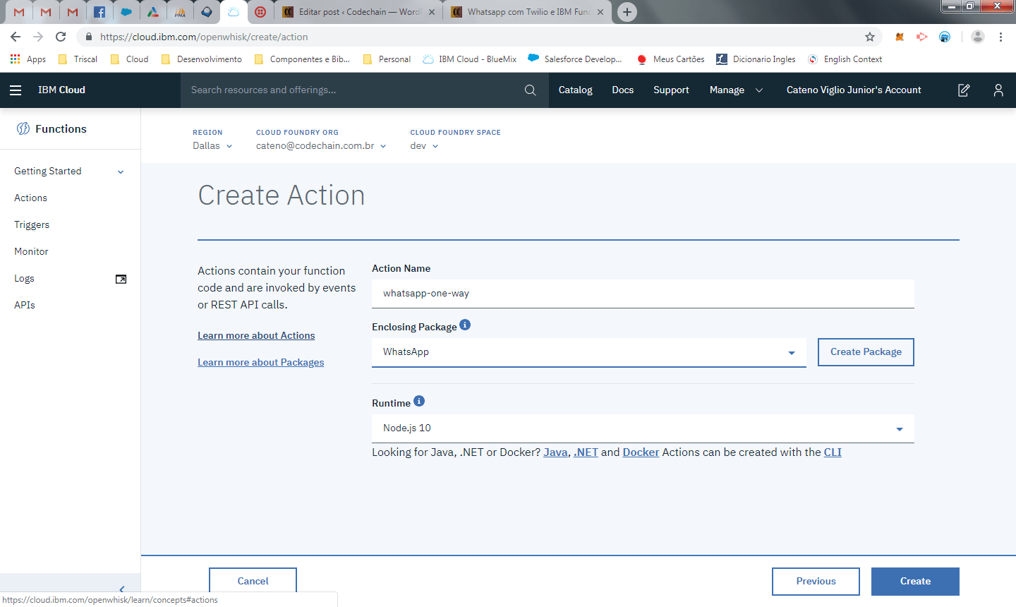 Clique em Start Creating -> Create Action. Informe o nome de um package para agrupar as funções que vamos criar, nomeie a sua função como whatsapp-one-way e selecione o seu runtime. No nosso caso estamos utilizando o nodeJS v10, mas caso queira utilizar outra linguagem fique a vontade.