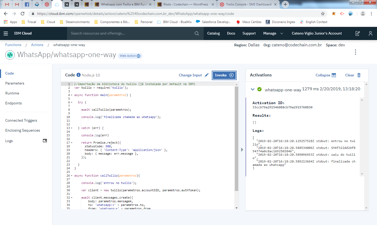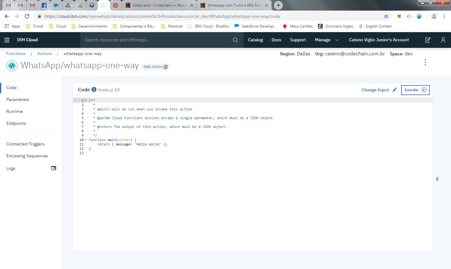 Apos salvar o código, clique em Invoke e voce deve receber a mensagem no whatasapp.