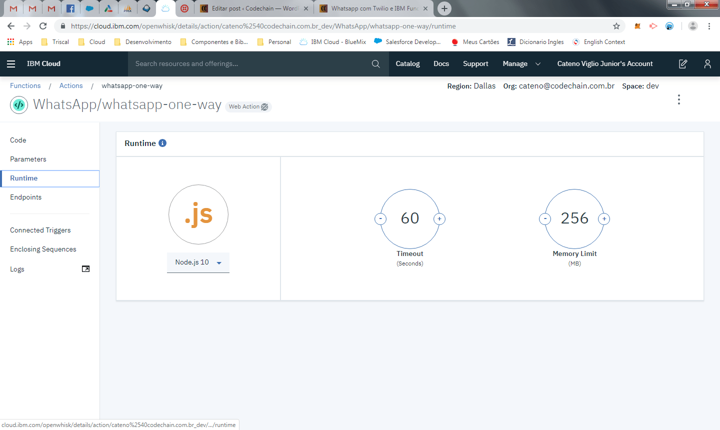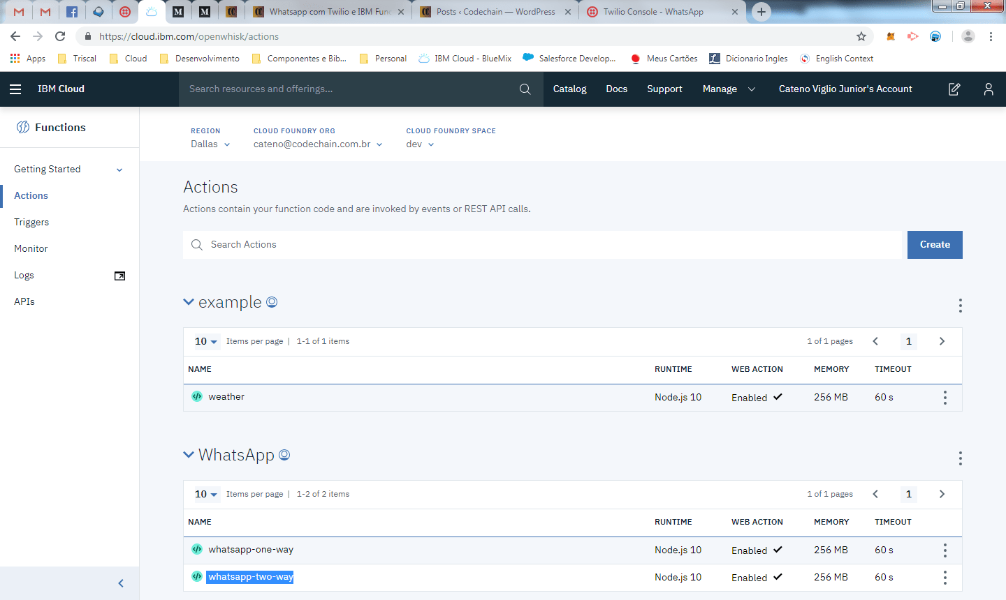 O primeiro monitoramento é sobre o que entra e sai das IBM functions que criamos, especialmente a two-way-message que é um webhook do Twilio e é um pouco mais complicada para testar.