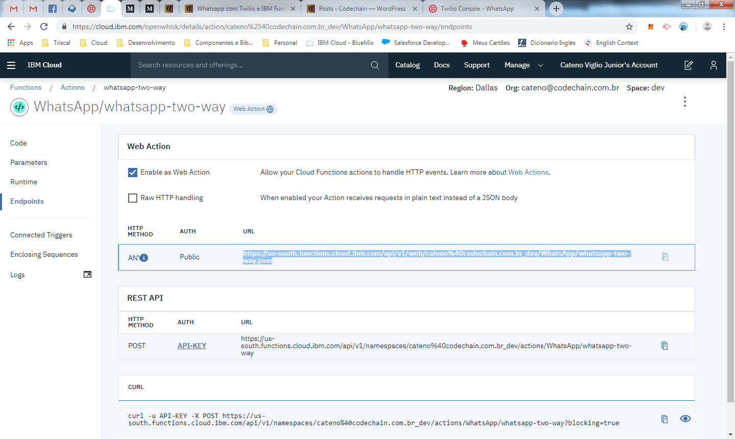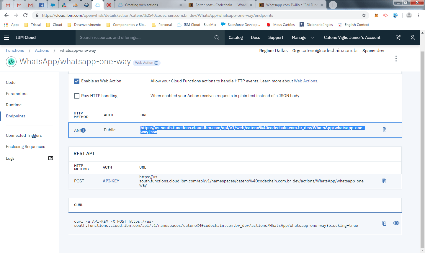 Nós temos uma nova função e um novo endpoint, copie a URL gerada para o web action.