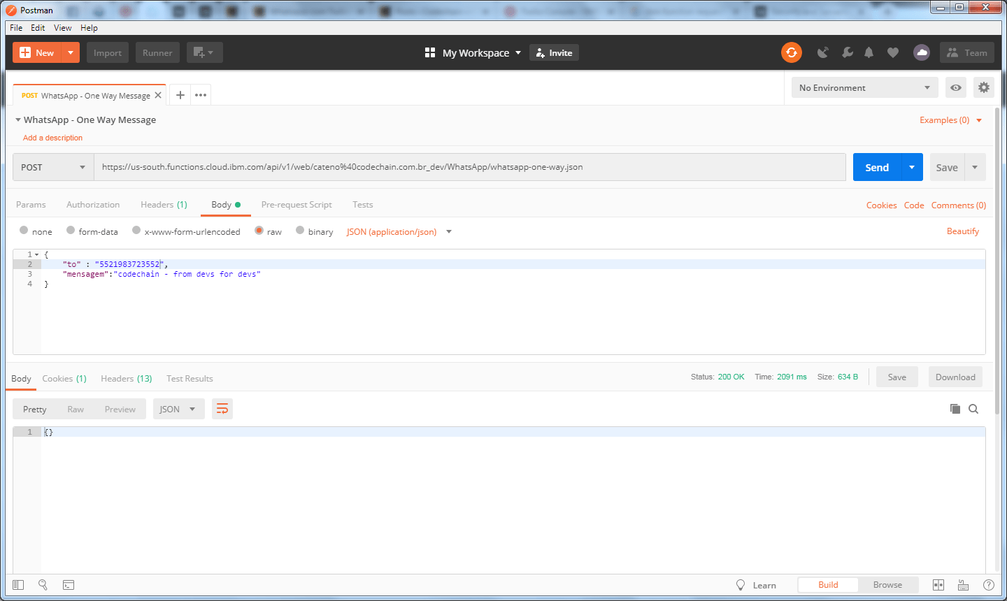 com esse teste, fechamos o endpoint one-way-message. Caso queira enviar uma mensagem para o whatsapp, basta chamar a API que construímos informando a mensagem e o numero de telefone.