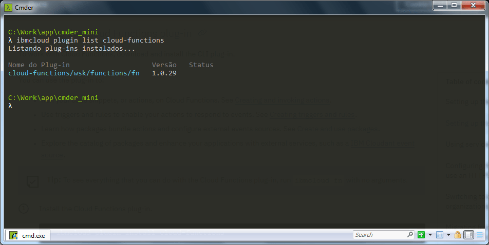 Apos a instalação, execute o comando ibmcloud plugin list cloud-functions para verificar se o plugin foi instalado corretamente. Deve ser exibida uma tela conforme abaixo