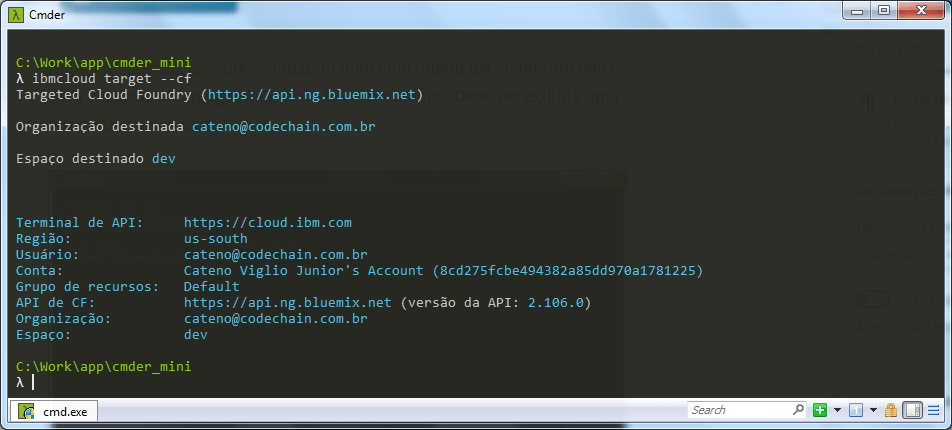 Alem da sua instalação padrão, é necessário instalar pacotes adicionais do client. Execute o login na sua conta através do comando ibmcloud login e execute o comando ibmcloud plugin install cloud-functions na sequencia.