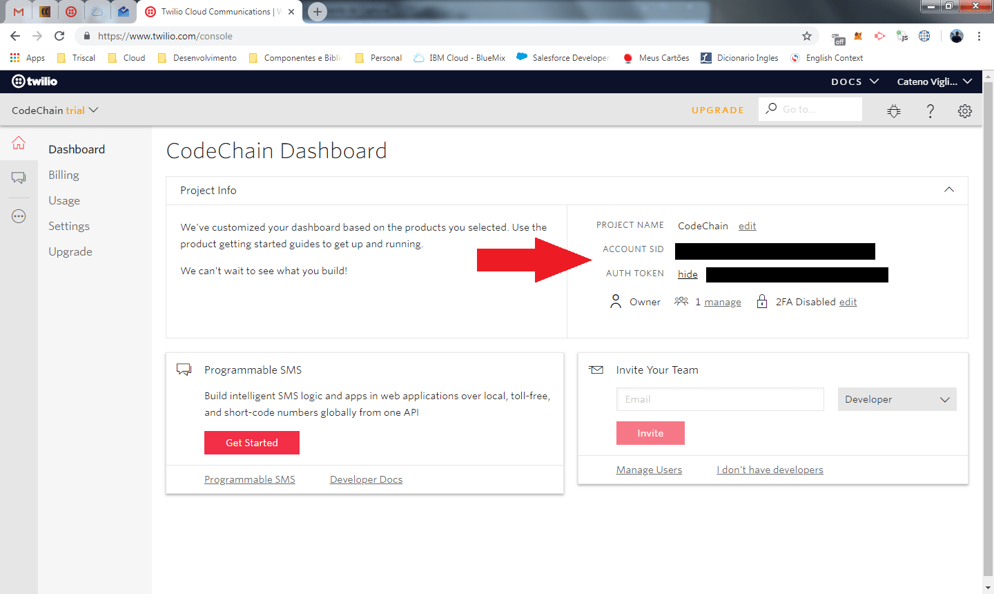 No passo seguinte, clique em skip, pois não vamos adicionar nenhum membro além de nós. Nosso projeto está criado e possui um ACCOUNT SID e AUTH TOKEN associado.