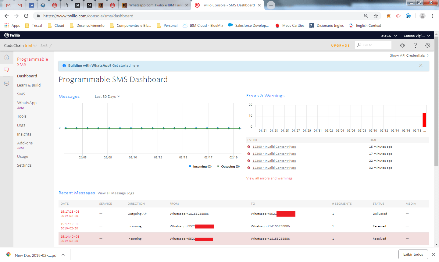 Saindo agora da cloud da IBM e voltando para interface do Twilio. Clique no dashboard para visualizar o histórico de mensagem trafegadas.